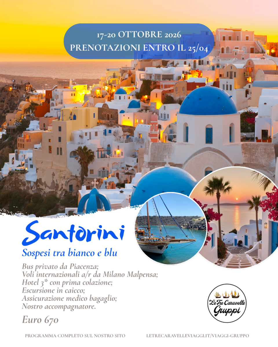 Ore 3.00 partenza con bus dallo Stadio Garilli di Piacenza in tempo utile per il volo da Milano Malpensa direzione Santorini con arrivo alle ore 7.00.